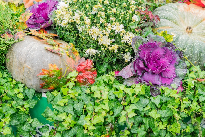 Хэллоуин осеннее украшение из тыквы и цветов хризантемы на улице. Концепция сельского рынка