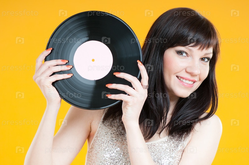 Портрет очаровательной молодой женщины с виниловой пластинкой