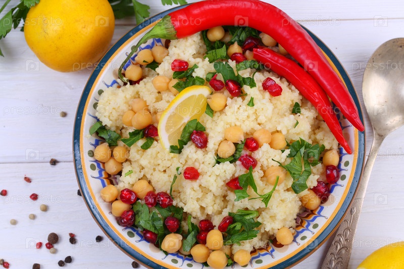 Восточное блюдо кускус с гранатом и нутом