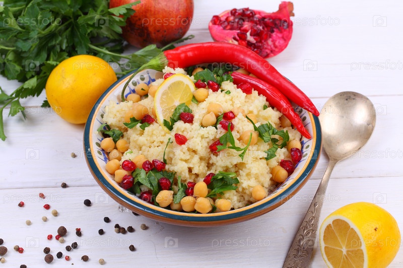 Восточное блюдо кускус с гранатом и нутом
