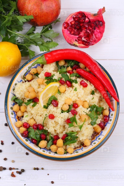 Восточное блюдо кускус с гранатом и нутом