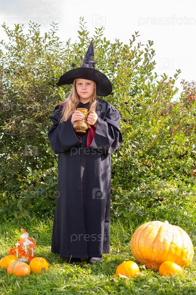 Хэллоуин. Девочка в мантии и шляпе. Маленькая волшебница в костюме