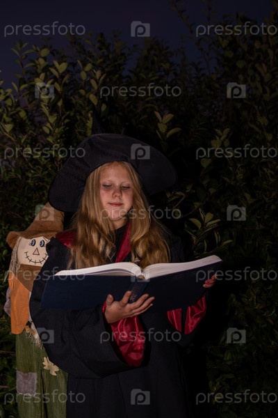 Хэллоуин. Девочка в мантии и шляпе. Маленькая волшебница в костюме