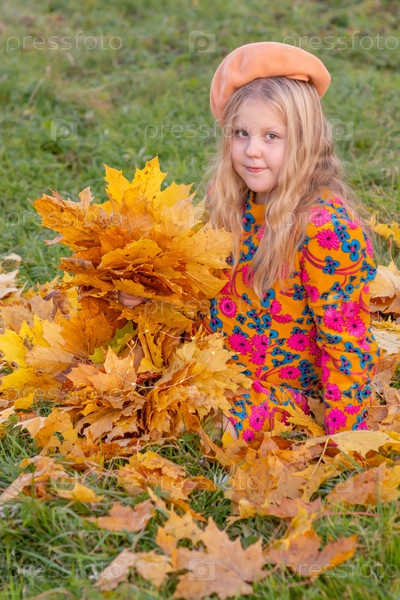 Осень. Девочка держит в руках опавшие осенние желтые красивые листья клена