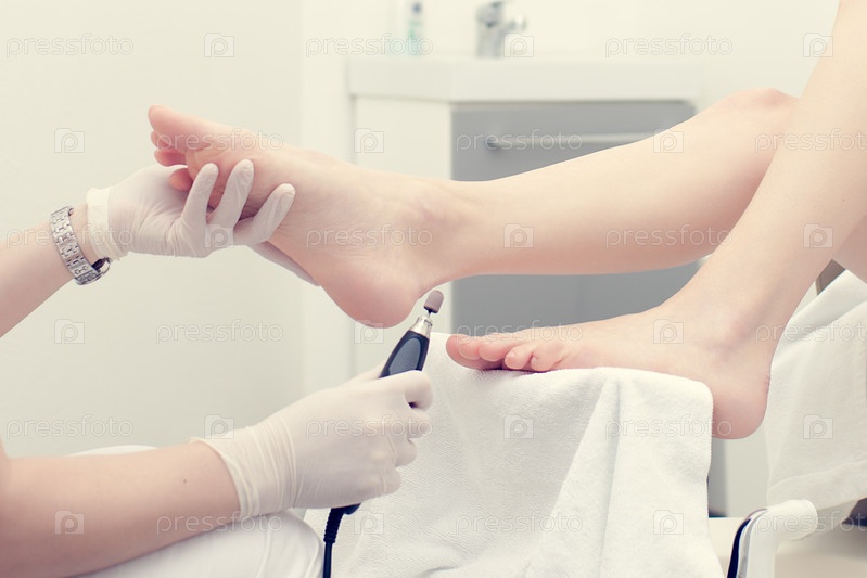 Процесс педикюра в салоне красоты крупным планом Процедура аппаратного педикюра в салоне красоты на светлом фоне