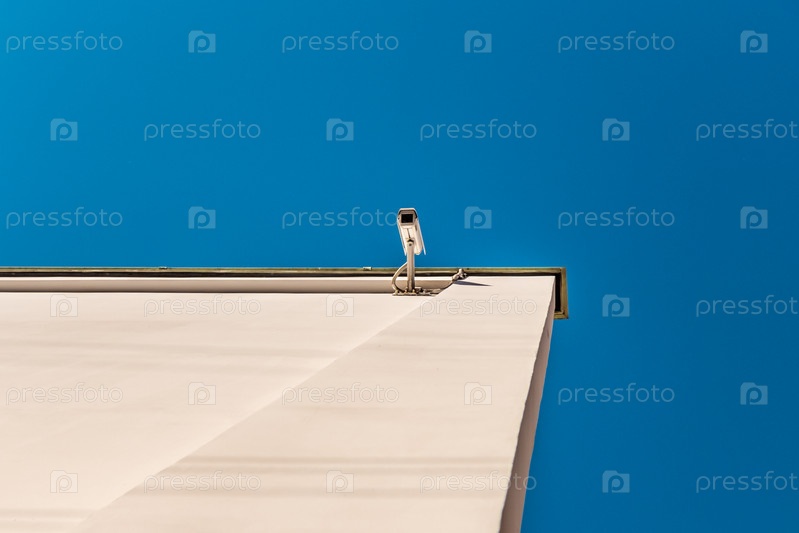 Городская камера видеонаблюдения на стене здания над голубым небом Городская камера наблюдения на стене дома на фоне синего неба