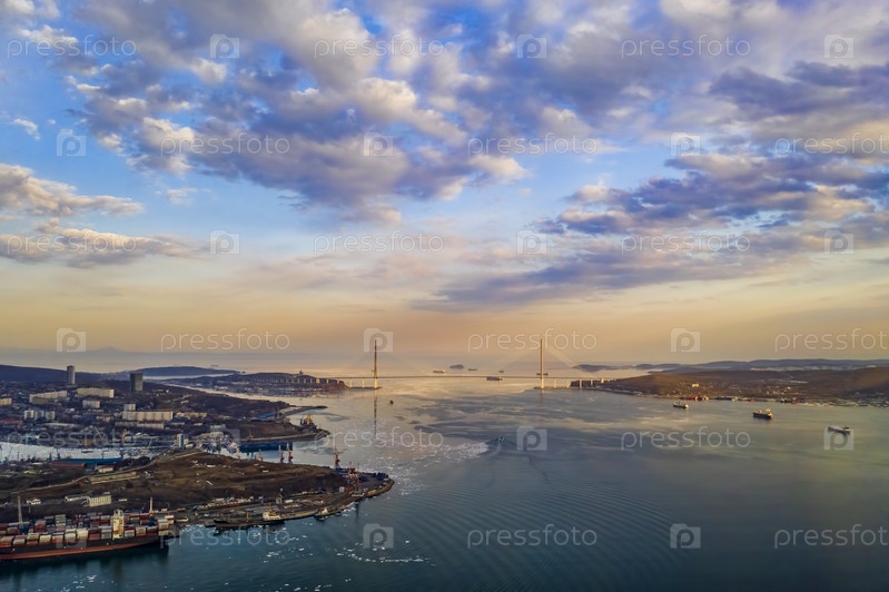 Вид с воздуха на Владивосток с видом на Русский мост