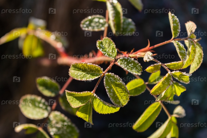 Первые заморозки в саду. Иней на листьях, первые заморозки. крупным планом