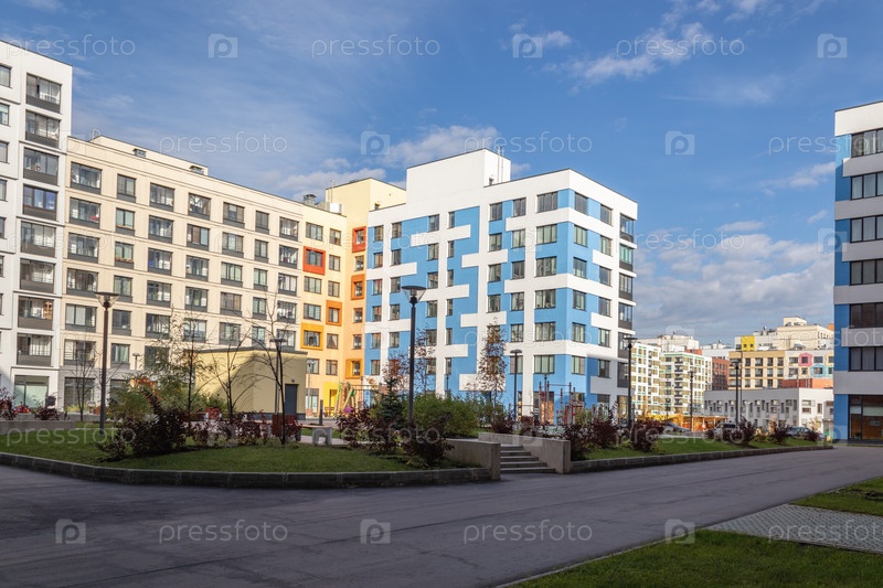 Современный многоквартирный дом с красочными фасадами на окраине города. Жилой комплекс «В лесу», Москва, Россия