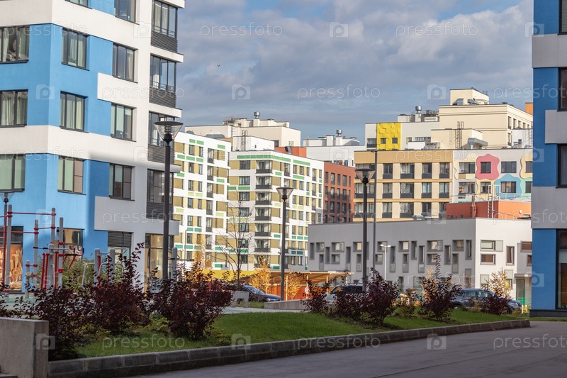 Современный многоквартирный дом с красочными фасадами на окраине города. Жилой комплекс «В лесу», Москва, Россия