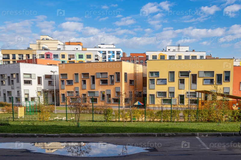 Современный многоквартирный дом с красочными фасадами на окраине города. Жилой комплекс «В лесу», Москва, Россия