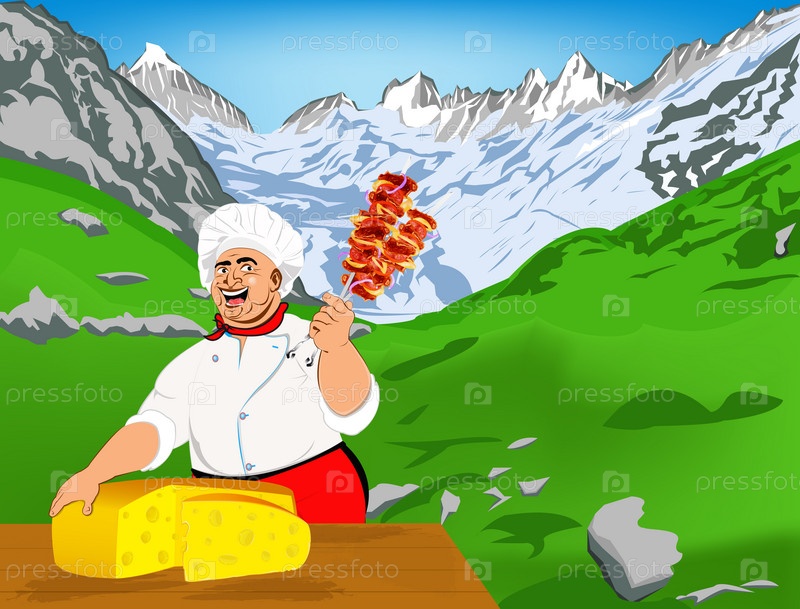Мужчина шеф-повар и аппетитный традиционный кавказский шашлык с молочным свежим сыром на фоне горного пейзажа