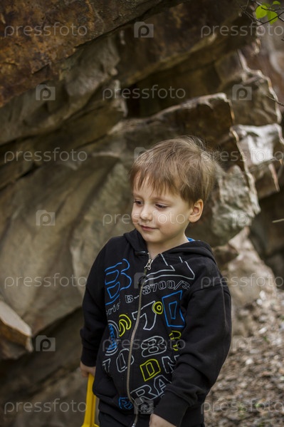 Мальчик-ребенок на фоне скалистой горы с любопытством смотрит на что-то и удивляется. Природа, скалы, горы