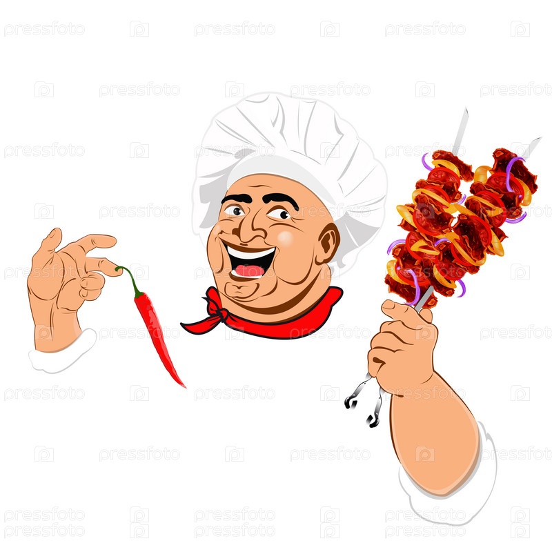 Мужчина шеф-повар и аппетитный традиционный кавказский шашлык на белом фоне
