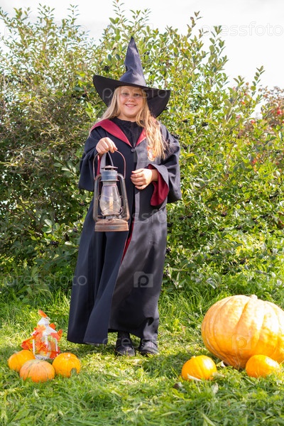 Хэллоуин. Девочка в мантии и шляпе. Маленькая волшебница в костюме