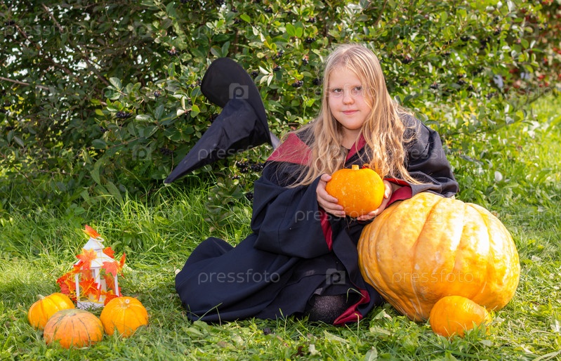 Хэллоуин. Девочка в мантии и шляпе. Маленькая волшебница в костюме