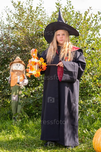Хэллоуин. Девочка в мантии и шляпе. Маленькая волшебница в костюме