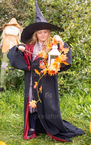 Хэллоуин. Девочка в мантии и шляпе. Маленькая волшебница в костюме