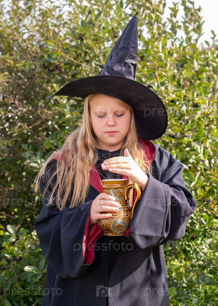 Хэллоуин. Девочка в мантии и шляпе. Маленькая волшебница в костюме