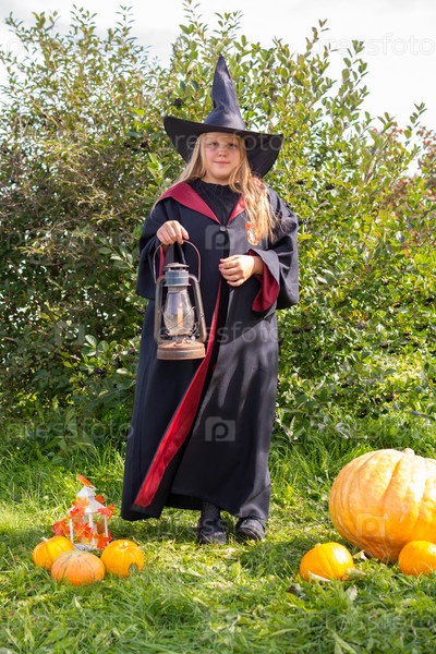 Хэллоуин. Девочка в мантии и шляпе. Маленькая волшебница в костюме