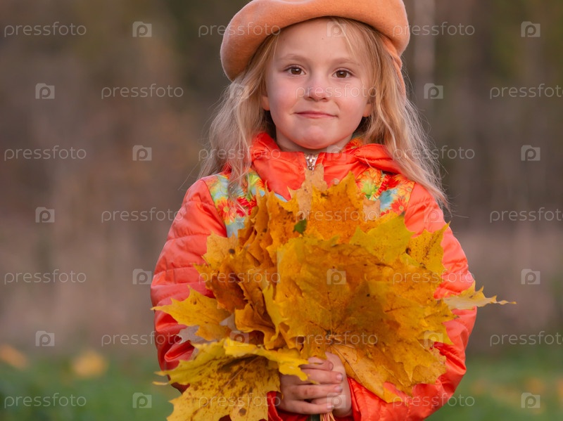 Осень. Девочка держит в руках опавшие осенние желтые красивые листья клена