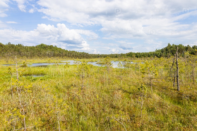 Болото в окружении леса. Заболоченная земля и заболоченная местность, топь, трясина