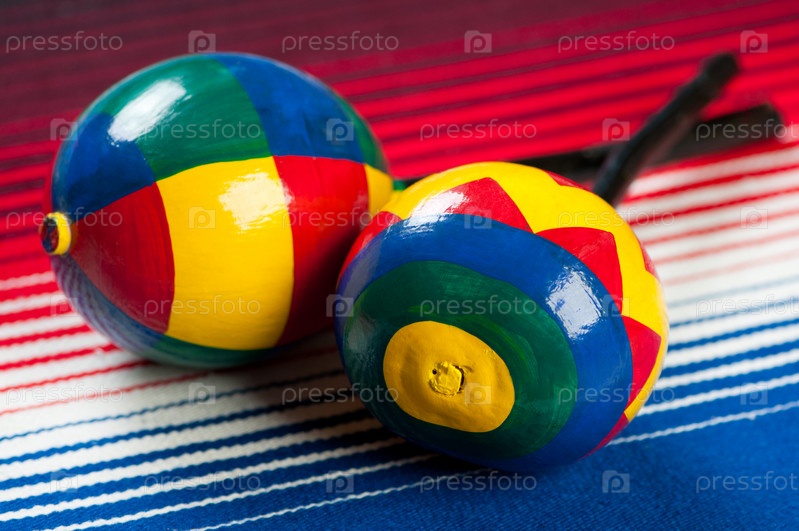 Два деревянных маракаса на мексиканском пончо крупным планом