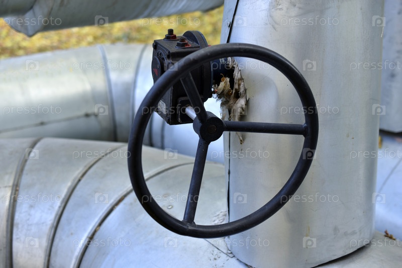 Клапаны из черного чугуна на водяной теплотрассе. Клапаны на трубах отопления в городе