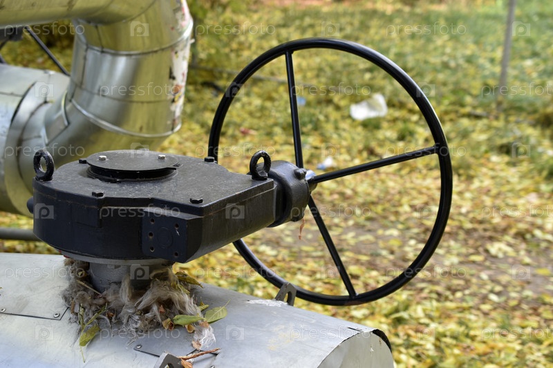 Клапаны из черного чугуна на водяной теплотрассе. Клапаны на трубах отопления в городе