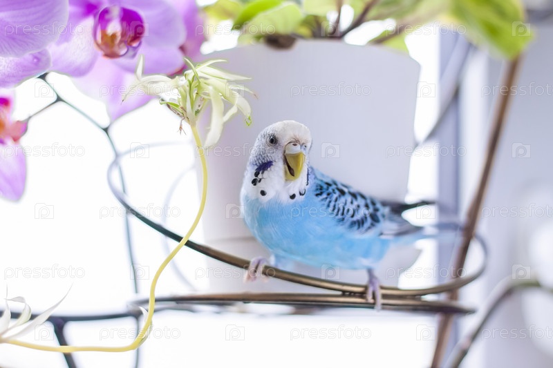 Красивый голубой волнистый попугайчик сидит без клетки на комнатном растении. Тропические птицы дома
