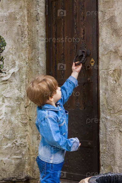 Маленький мальчик стоит и пытается открыть старую мощную дверь