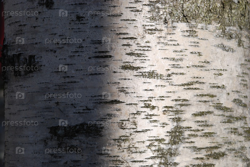Крупный план ствола березы среднего размера. Фактурная часть ствола березы со светло-белой корой и мхом на ней освещена солнцем с одной стороны