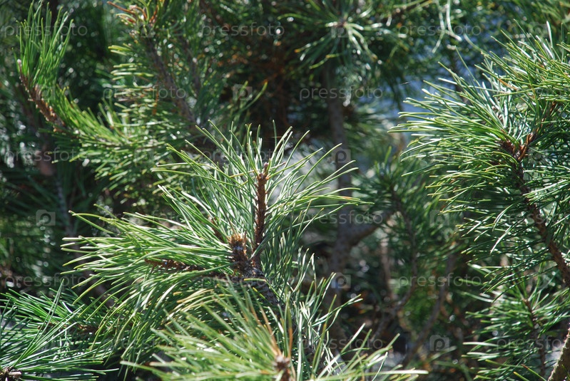 Пушистые зеленые ветки с иголками хвойного дерева. Под лучами весеннего солнца коричневые ветки хвойного дерева с множеством зеленых иголок создают ощущение воздушного пуха