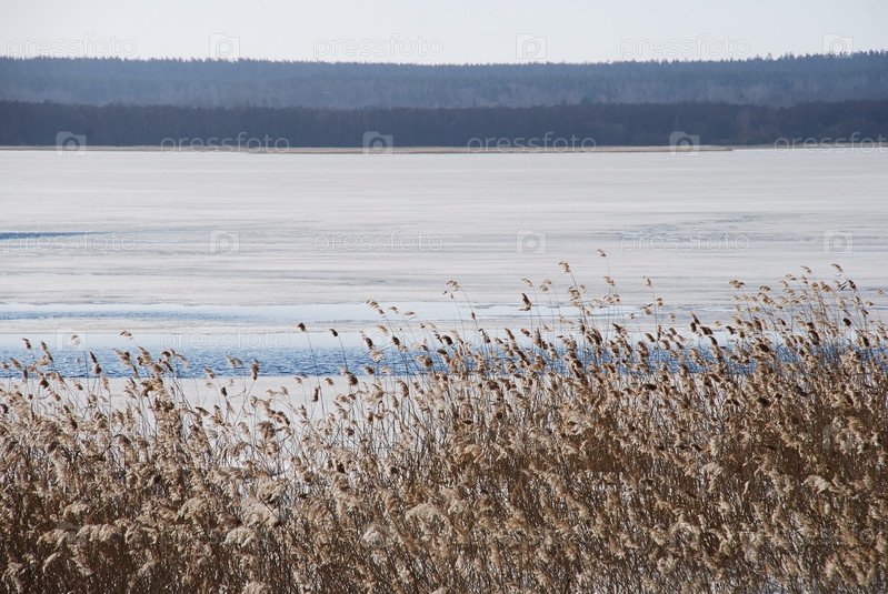 Тростник лед и вода на широкой реке. В солнечный весенний день изо льда у берега реки растут сухие высокие желтые камыши. В середине реки открытая вода и лед