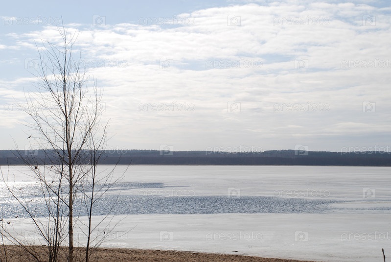 Голубая речная вода под весенним солнцем. На реке у берега и вдалеке лед белый, середина реки с открытой голубой водой на берегу песок и кусты без листьев