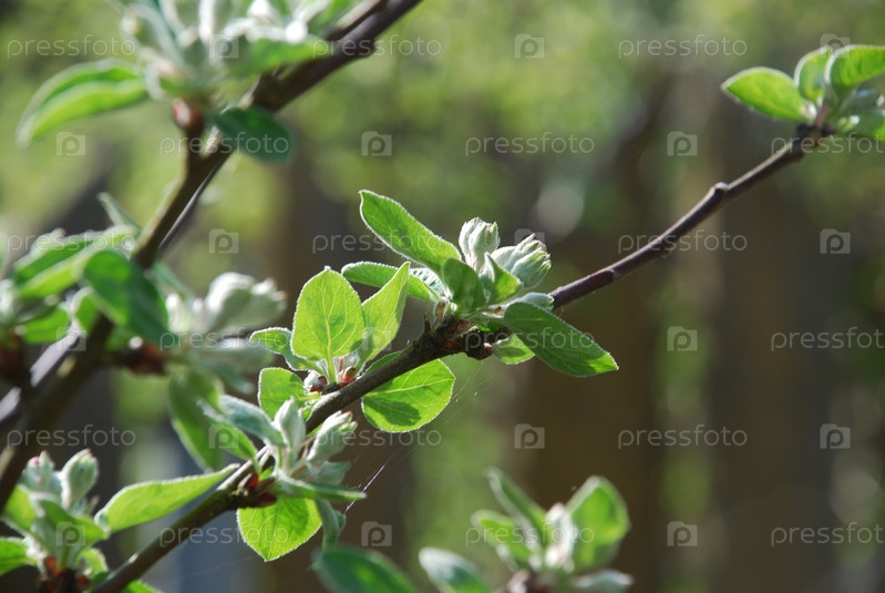 На темном фоне тонкая ветка яблони. На ветке яблони молодые зеленые листья словно усыпаны цветками яблони, которые пушистые среди листвы, готовые распуститься