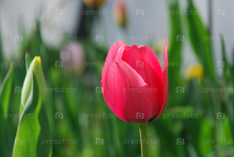 Зеленые и красные бутоны тюльпанов. Зеленый закрытый бутон тюльпана и красный полуоткрытый цветок тюльпана на тонких стеблях в окружении широких листьев на фоне зеленых трав
