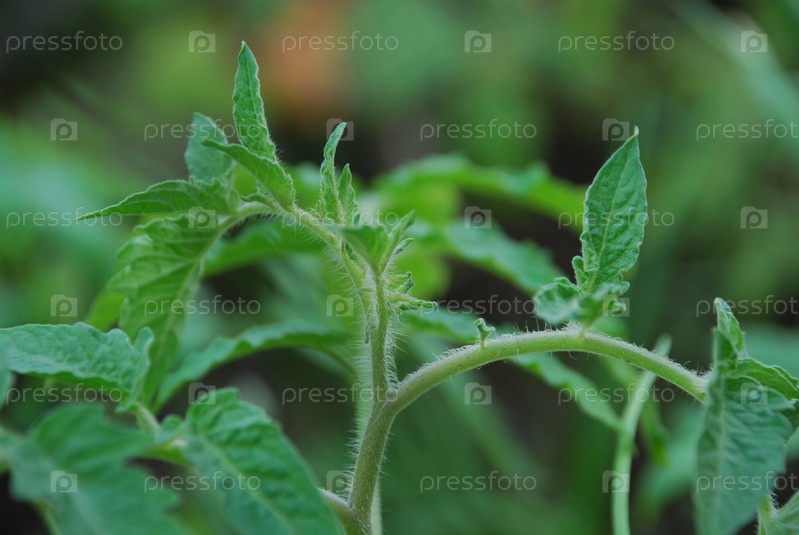 Зеленые листья томатного растения в теплице. Резкий план на стеблях и фактурных листьях помидоров на фоне зелени и земли. Листья разного размера с неровными краями
