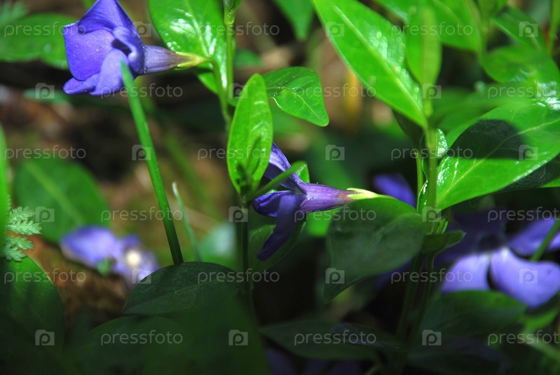 Мелкие цветки барвинка мелкие. Крупный план маленького голубого с фиолетовым оттенком цветка Малый барвинковый лес, окруженный зеленой травой и широкими листьями