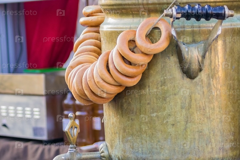 Традиционная русская церемония - чай, самовар и рогалики или баранка