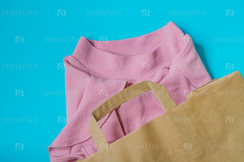 Розовая женская блузка в бумажном ремесленном пакете на синем фоне. Продажа одежды и концепция черной пятницы. Вид сверху