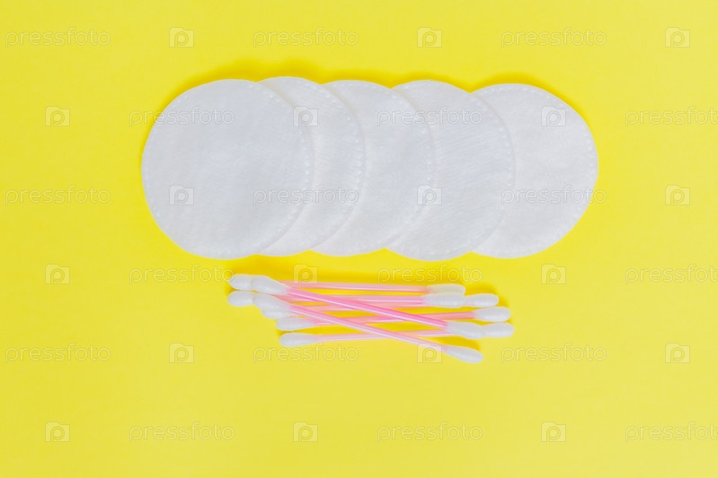 Косметические ватные диски и ватовые палочки на белом фоне.Сделайте концепцию yp и уход за кожей