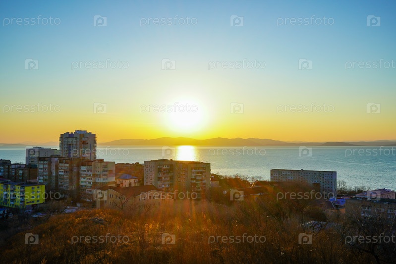 Закат на фоне моря и городского пейзажа,