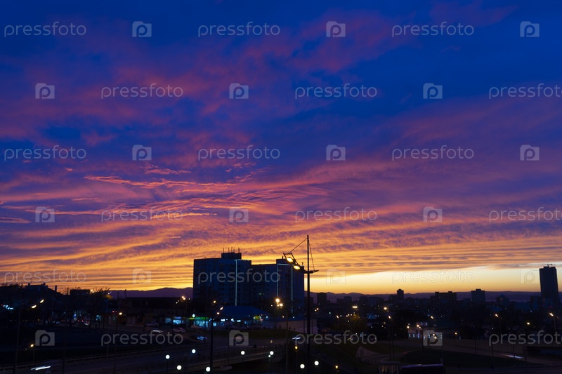 Городской пейзаж под вечерним фиолетовым небом
