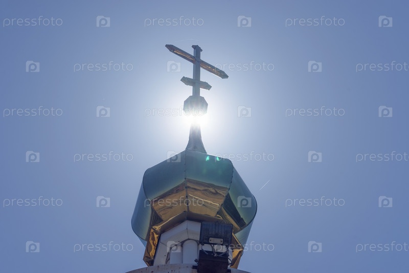 Золотой купол часовни на фоне голубого неба. Владивосток