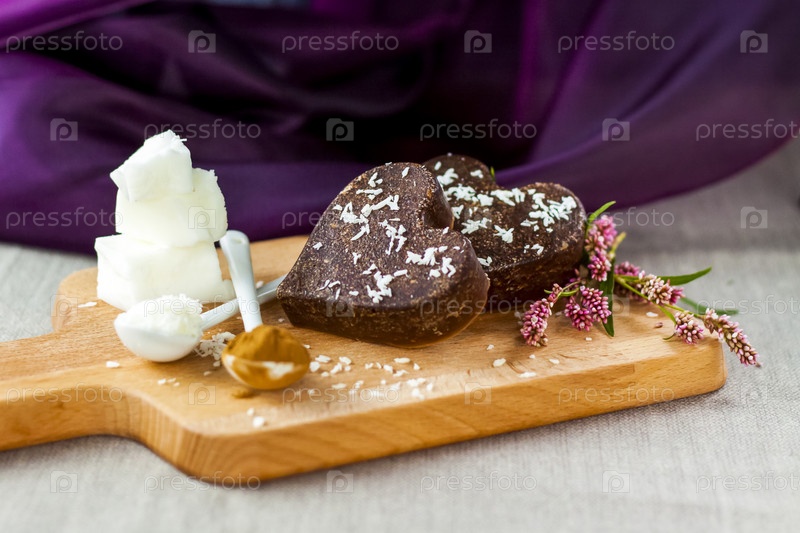 На столе конфеты ручной работы из кокосового масла, кокосовой стружки и какао. десерт по рецепту правильного питания