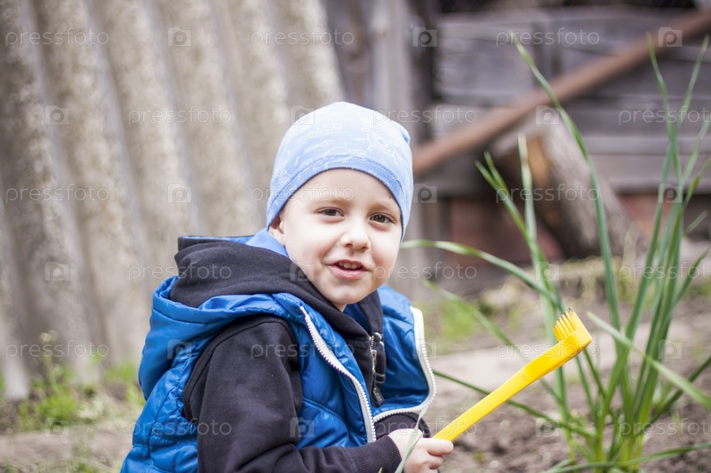 Ребенок сажает огород. Детские грабли в руках. Маленький мальчик-садовник сажает растения на клумбе. Садовые инструменты в руках ребенка