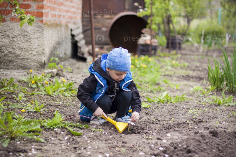 Ребенок сажает огород. Детские грабли в руках. Маленький мальчик-садовник сажает растения на клумбе. Садовые инструменты в руках ребенка