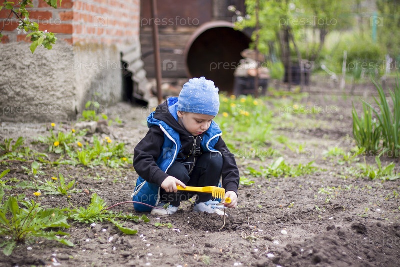 Ребенок сажает огород. Детские грабли в руках. Маленький мальчик-садовник сажает растения на клумбе. Садовые инструменты в руках ребенка