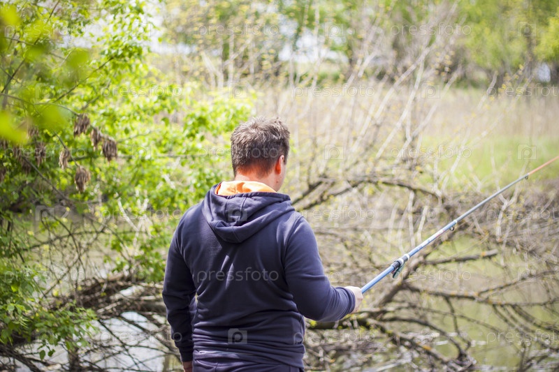 Мужчина-рыбак стоит у реки с простой удочкой, мужчина отдыхает во время рыбалки, яркое весеннее солнце